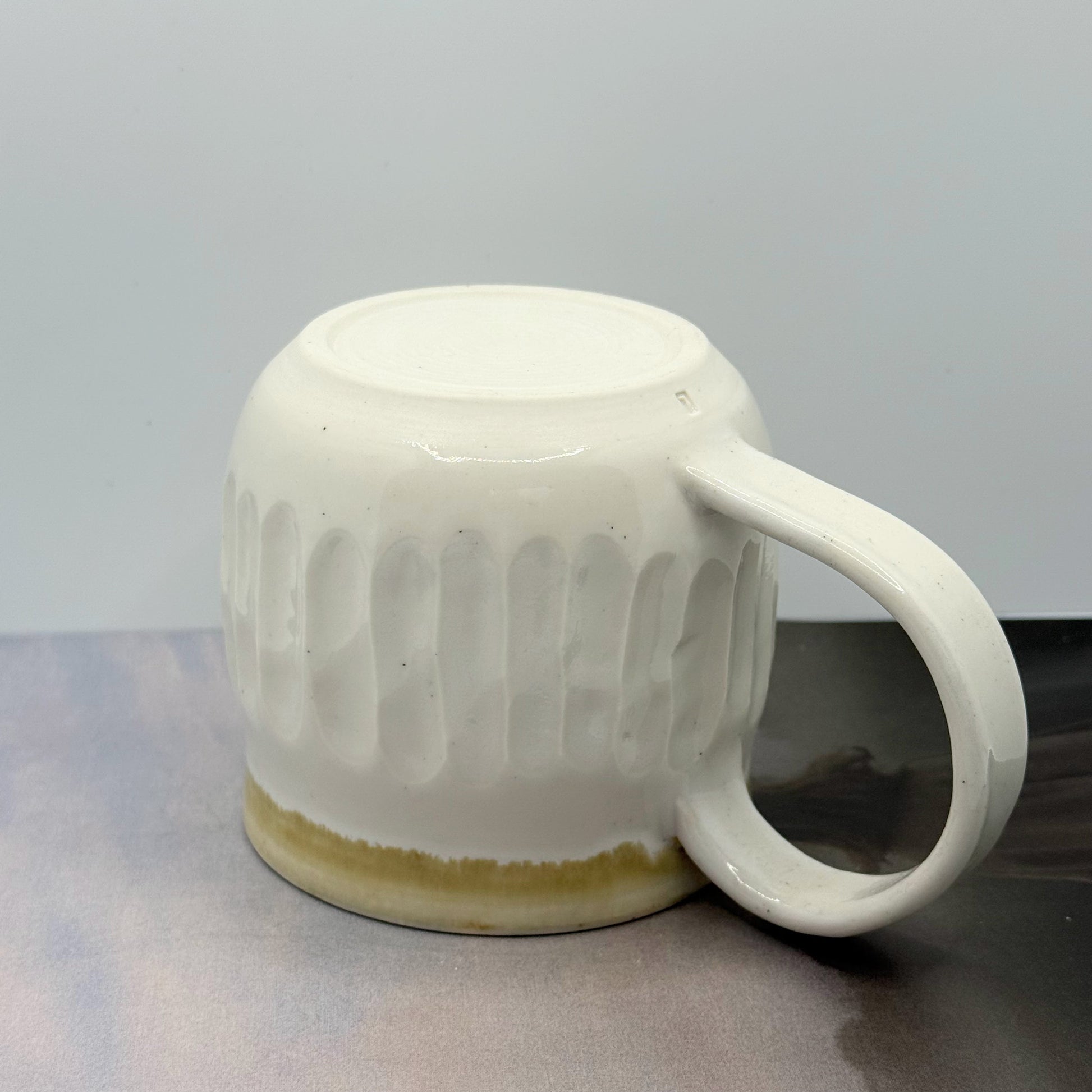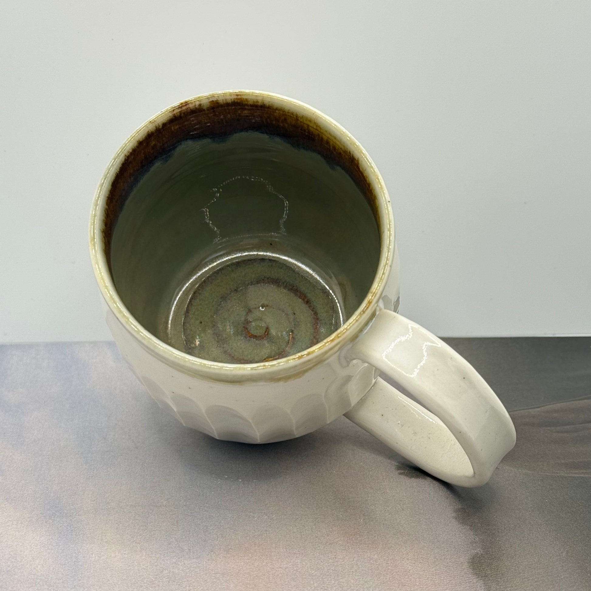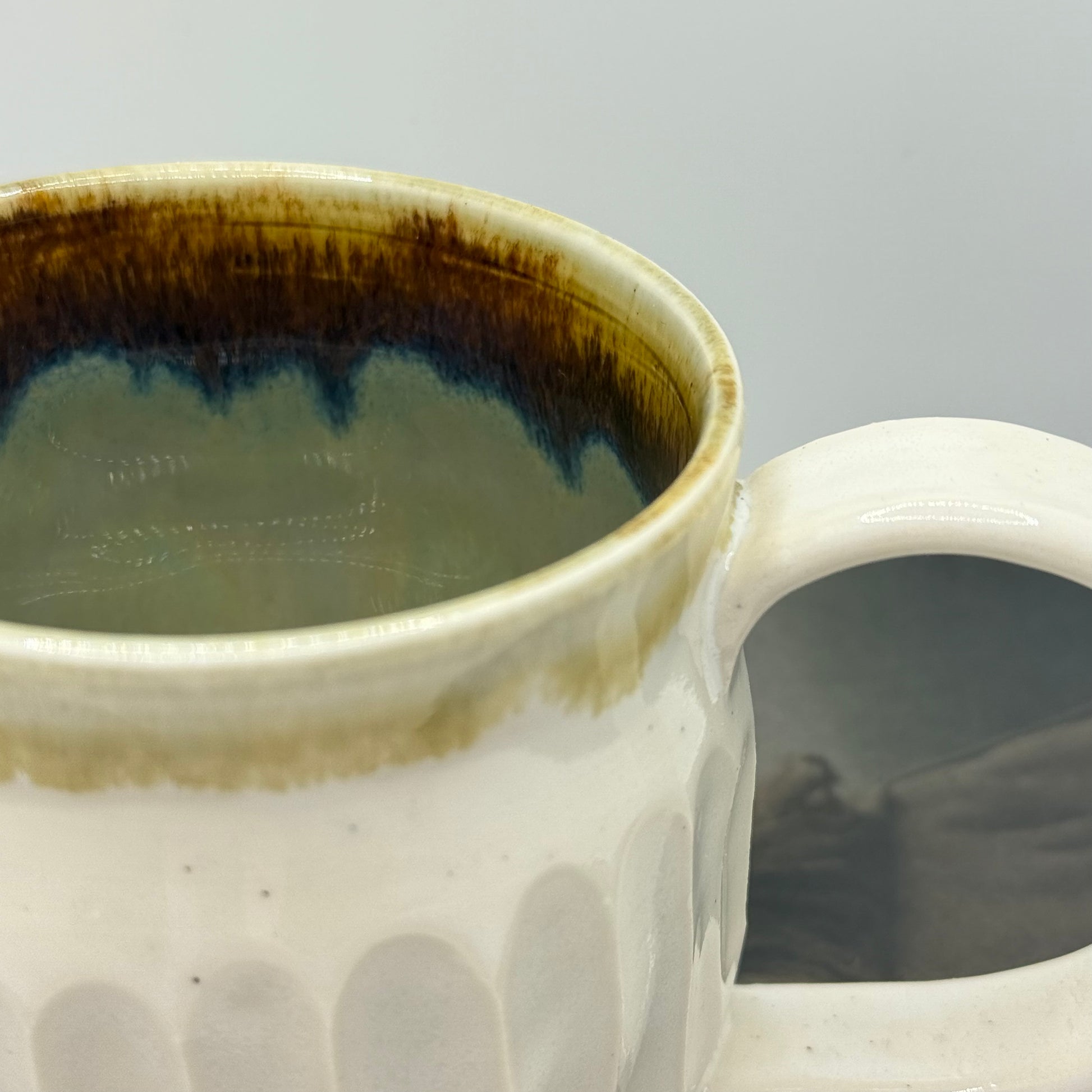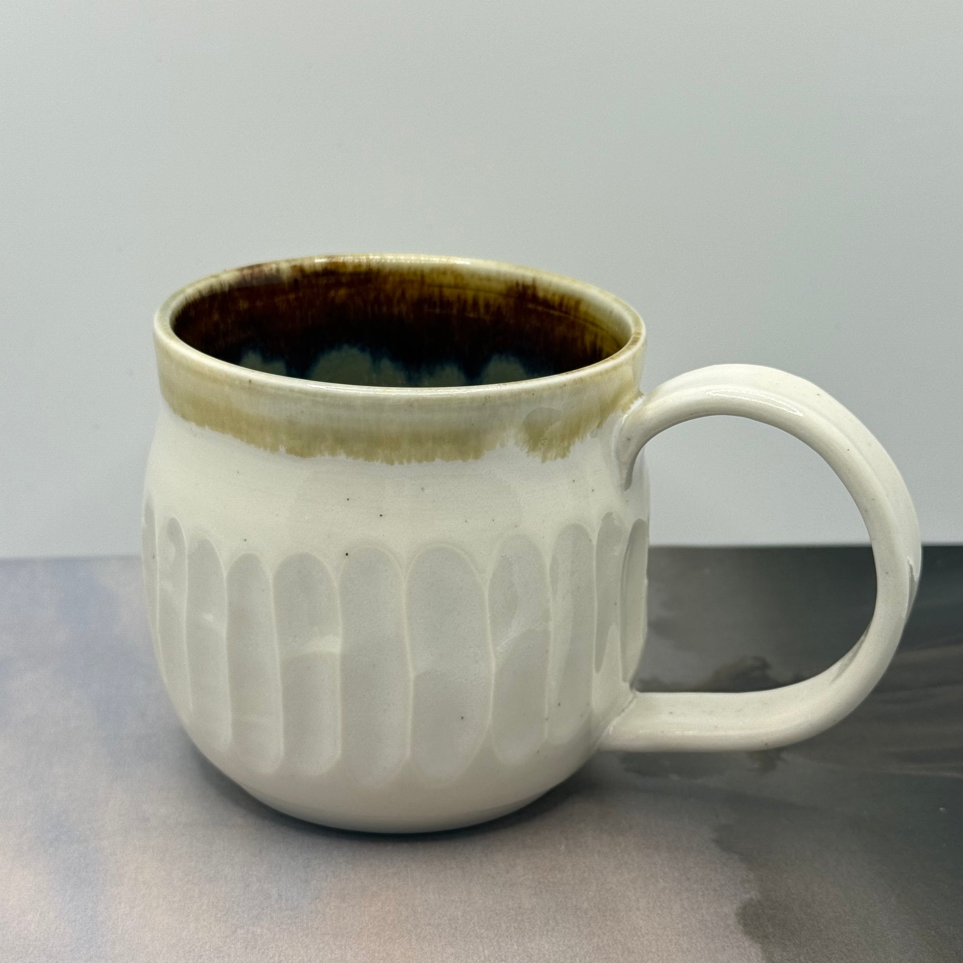 Porseleinen mok met bruingroene druipglazuur. Om de set van foto vier te bestellen, bestel je ook deze mok: https://lumceramics.nl/products/mok-wit-ii