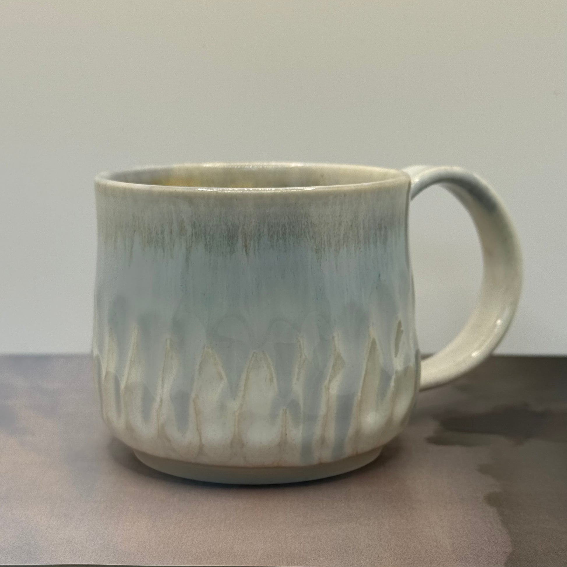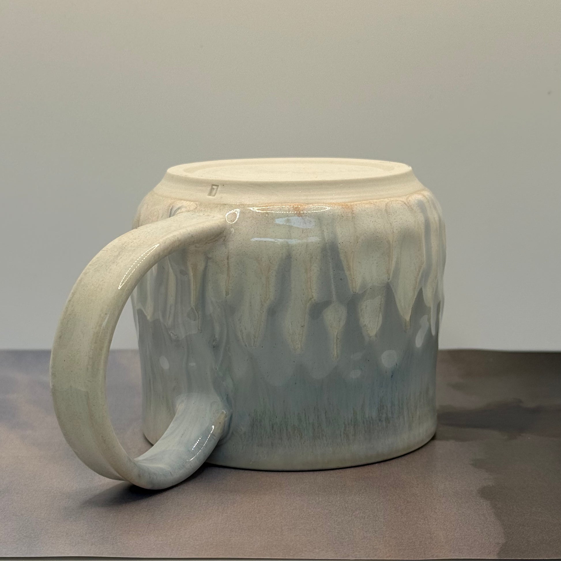 Porseleinen mok met wit en lichtblauw druipglazuur. Om de set van foto drie te bestellen, bestel je ook deze mok: https://lumceramics.nl/products/mok-lichtblauw-ii